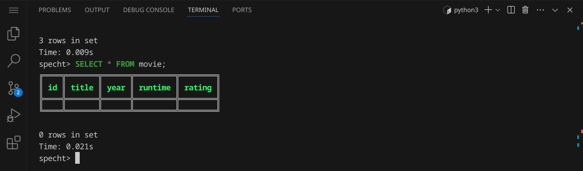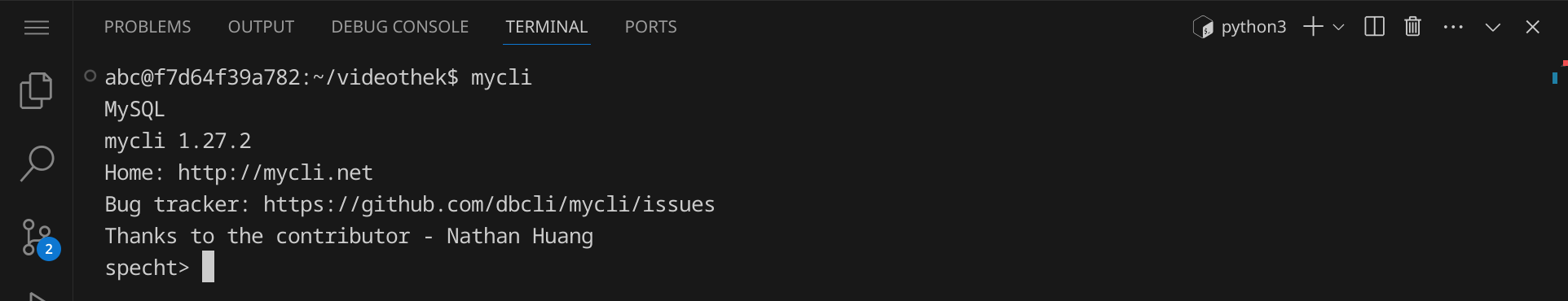 Um den Code auszuführen, geben wir die Befehle an mycli. Öffne dazu ein Terminal und gib folgenden Befehl ein: