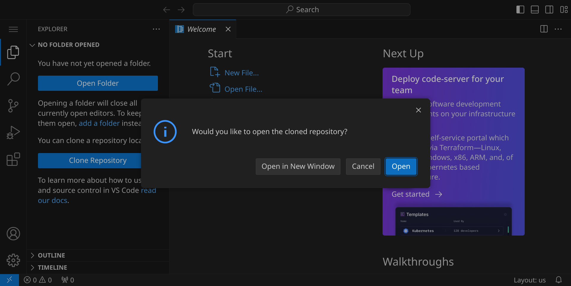 Beantworte die Frage »Would you like to open the cloned repository?« mit »Open«.