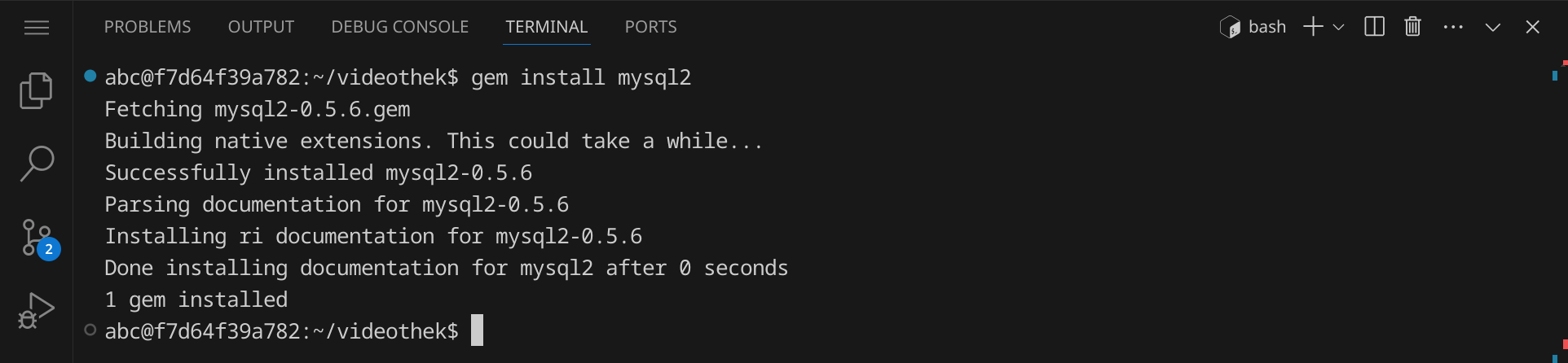 Bevor wir das Skript ausführen können, müssen wir noch das Rubygem mysql2 installieren. Öffne dazu ein Terminal und gib folgenden Befehl ein: