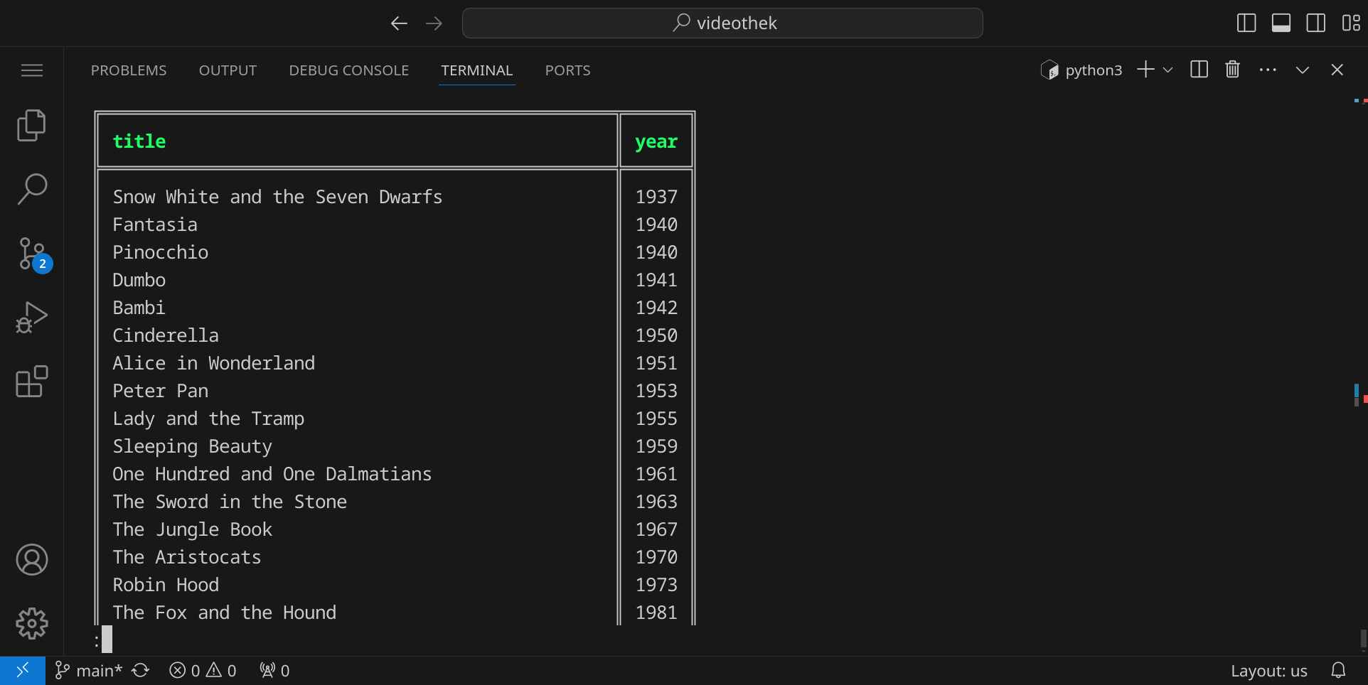 Erweitere außerdem bei der Gelegenheit gleich die Tabelle movie um die Spalte german_title. Exportiere das SQL-Schema erneut als videothek.sql, setze deine Datenbank zurück und gib die Datei an mycli: