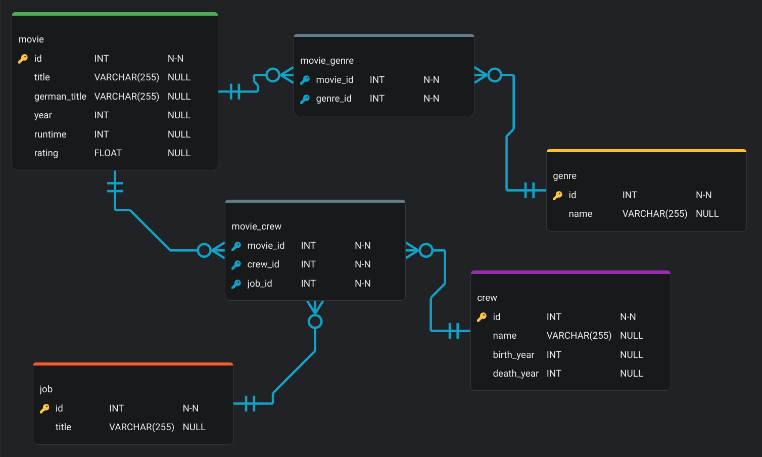 movie_crew werden diesmal drei Tabellen miteinander verbunden. Alle drei Fremdschlüssel sind gleichzeitig Primärschlüssel, da sie zusammen eindeutig sind, weil eine Person in einem Film mehrere Jobs haben kann.